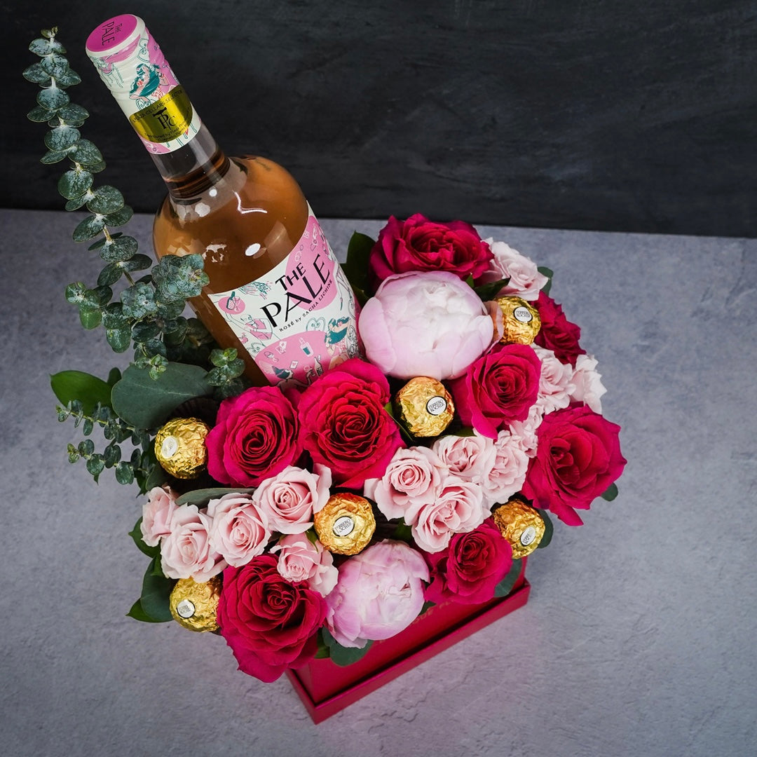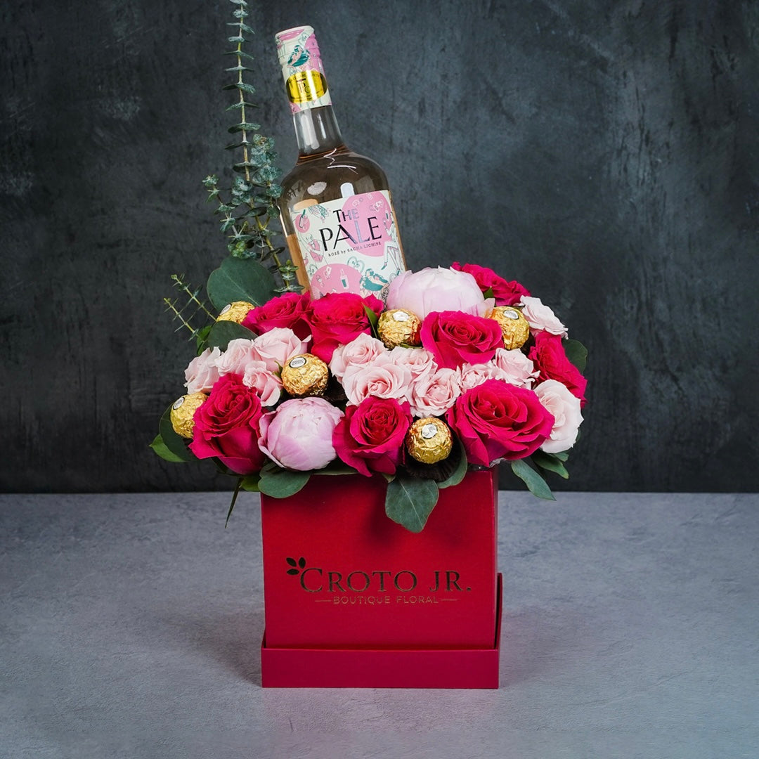 Es un momento mágico de danza y alegría compartida. En este escenario encantado, una copa de vino rosado brilla bajo la luz suave, mientras el dulce aroma de flores rosadas llena el aire, evocando ternura y frescura. A su lado, unos chocolates delicadamente dispuestos invitan a un dulce deleite, creando una atmósfera de romance y complicidad.