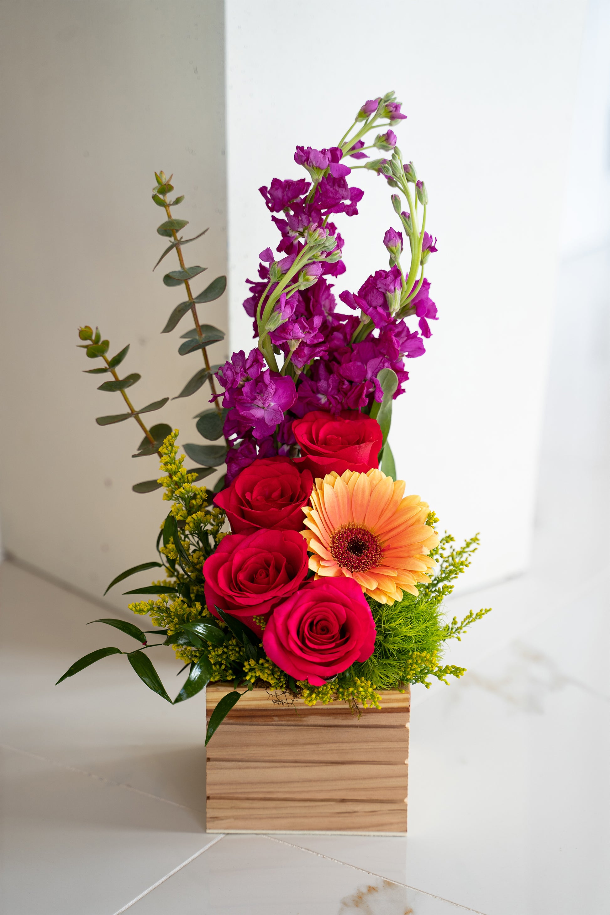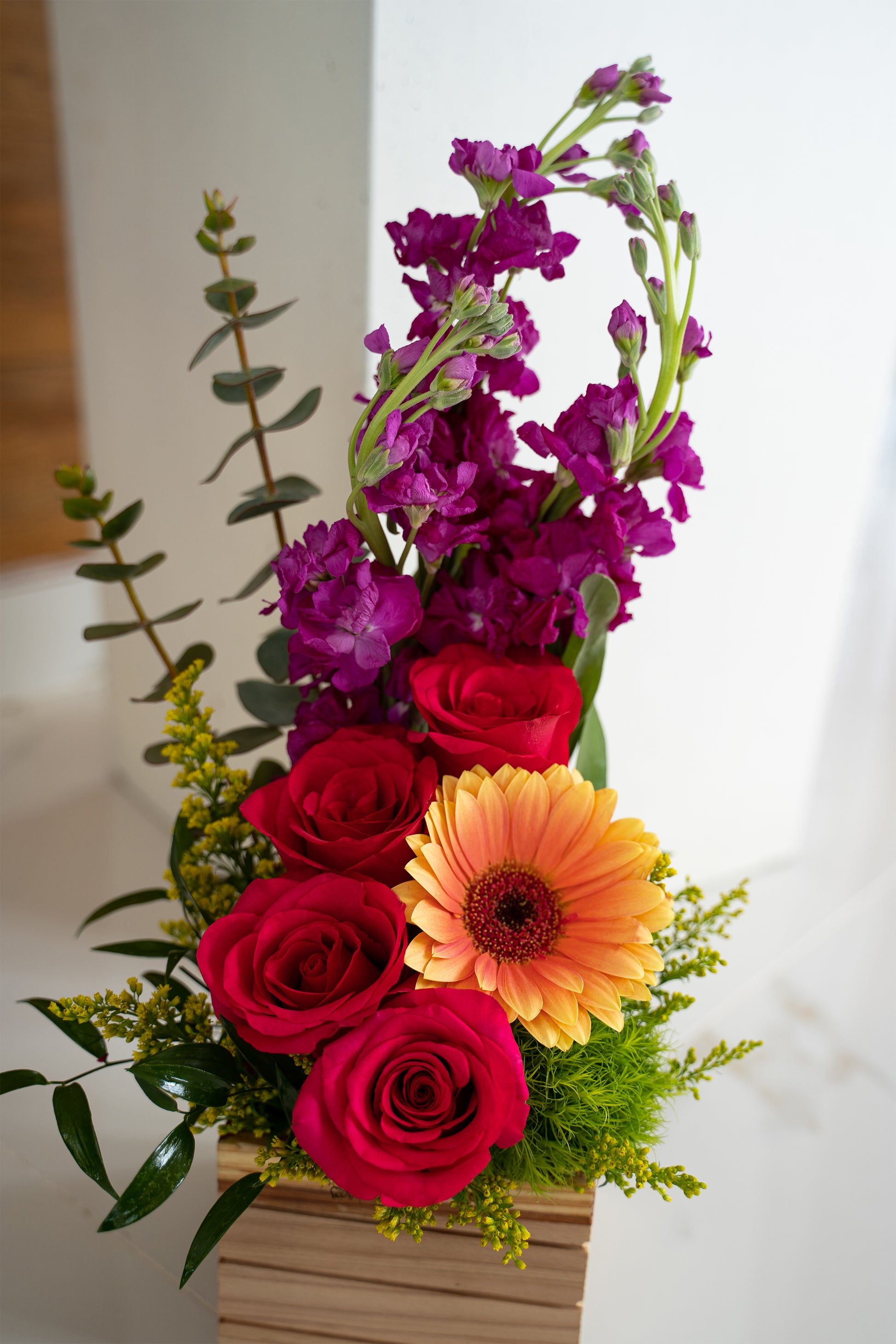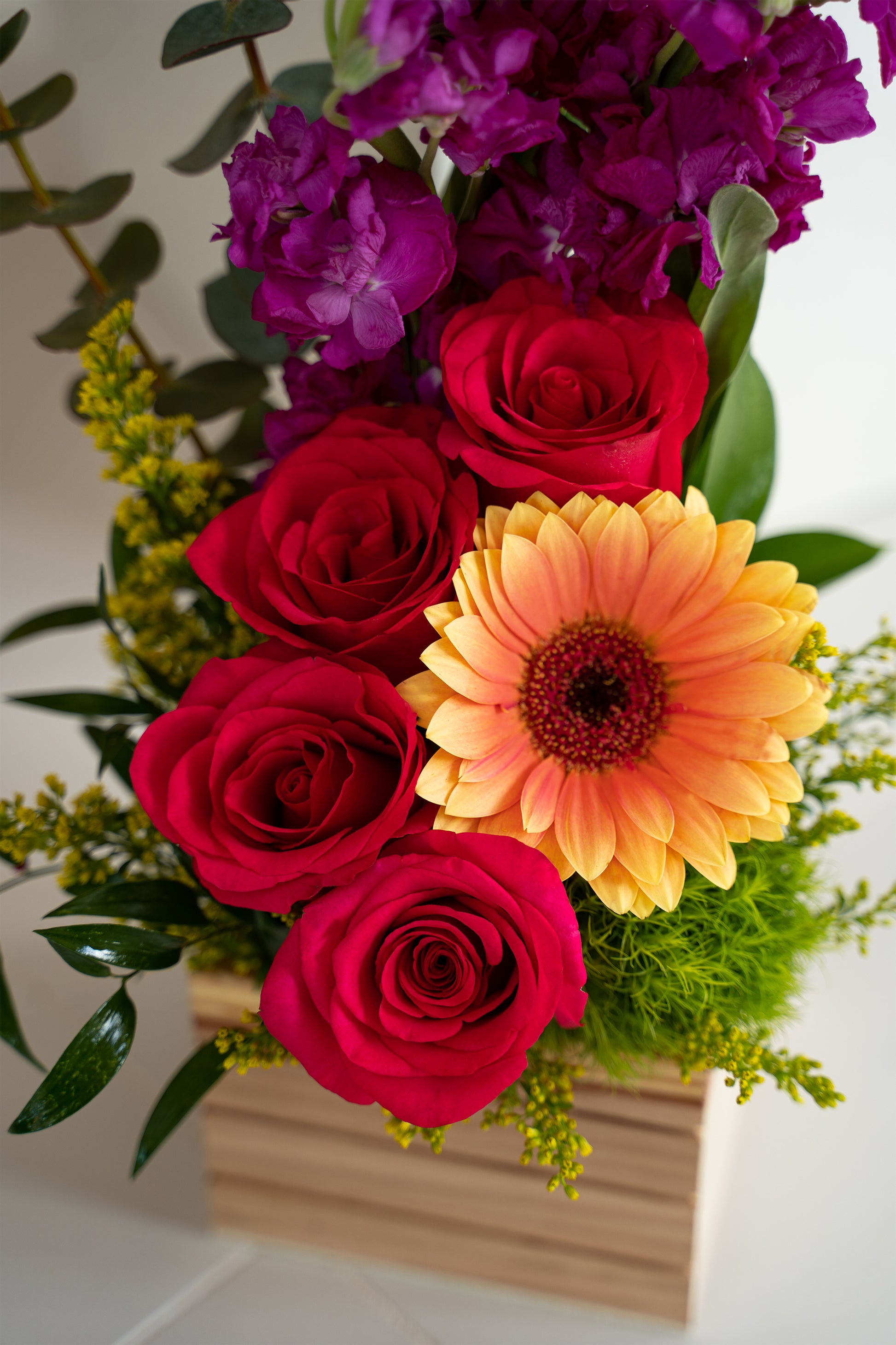 Delicado diseño de rosas color fucsia con margaritas africanas y stock.