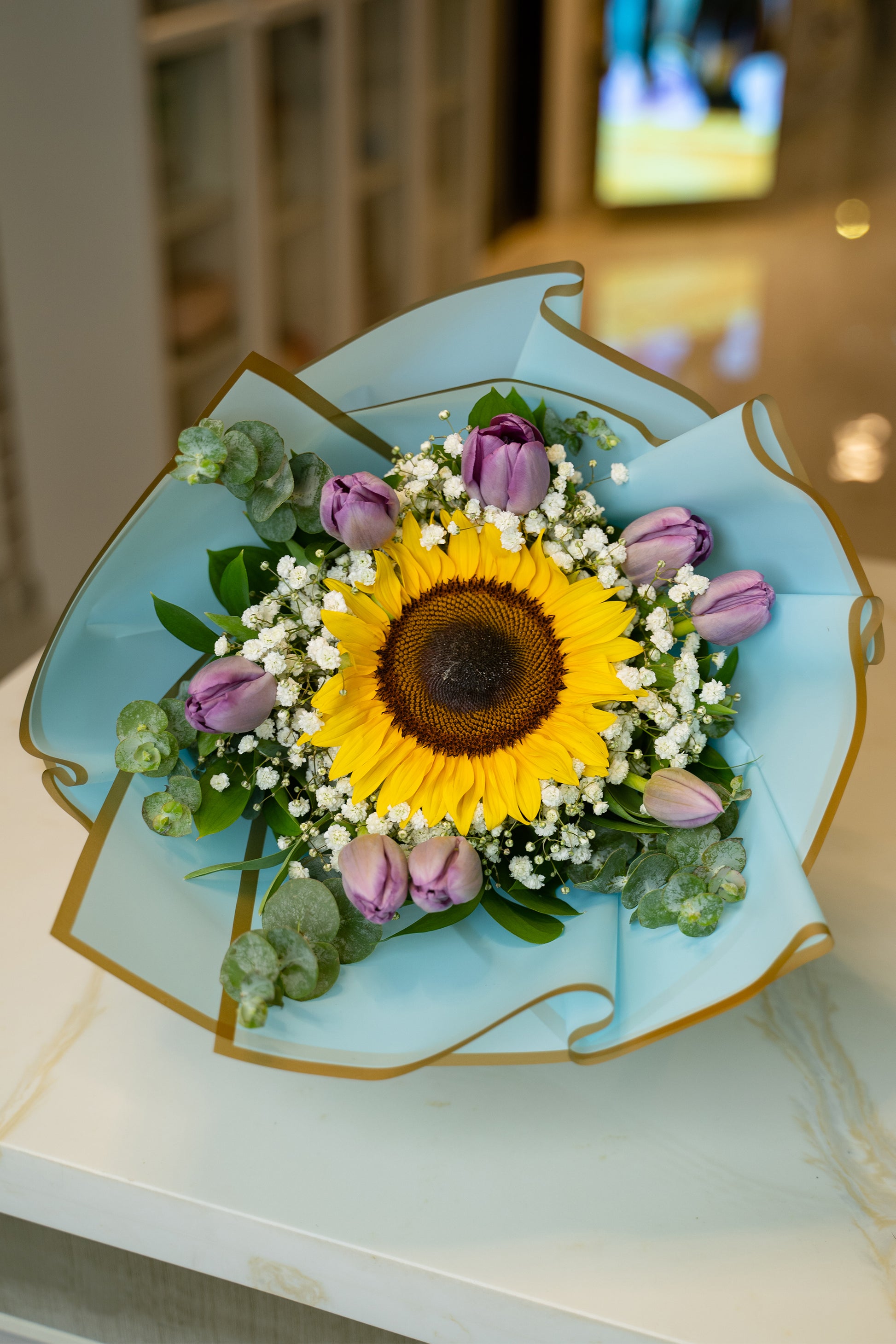 Bouquet Cono diseñado con tulipanes y girasol envuelto en papel floral brindando una envoltura elegante.