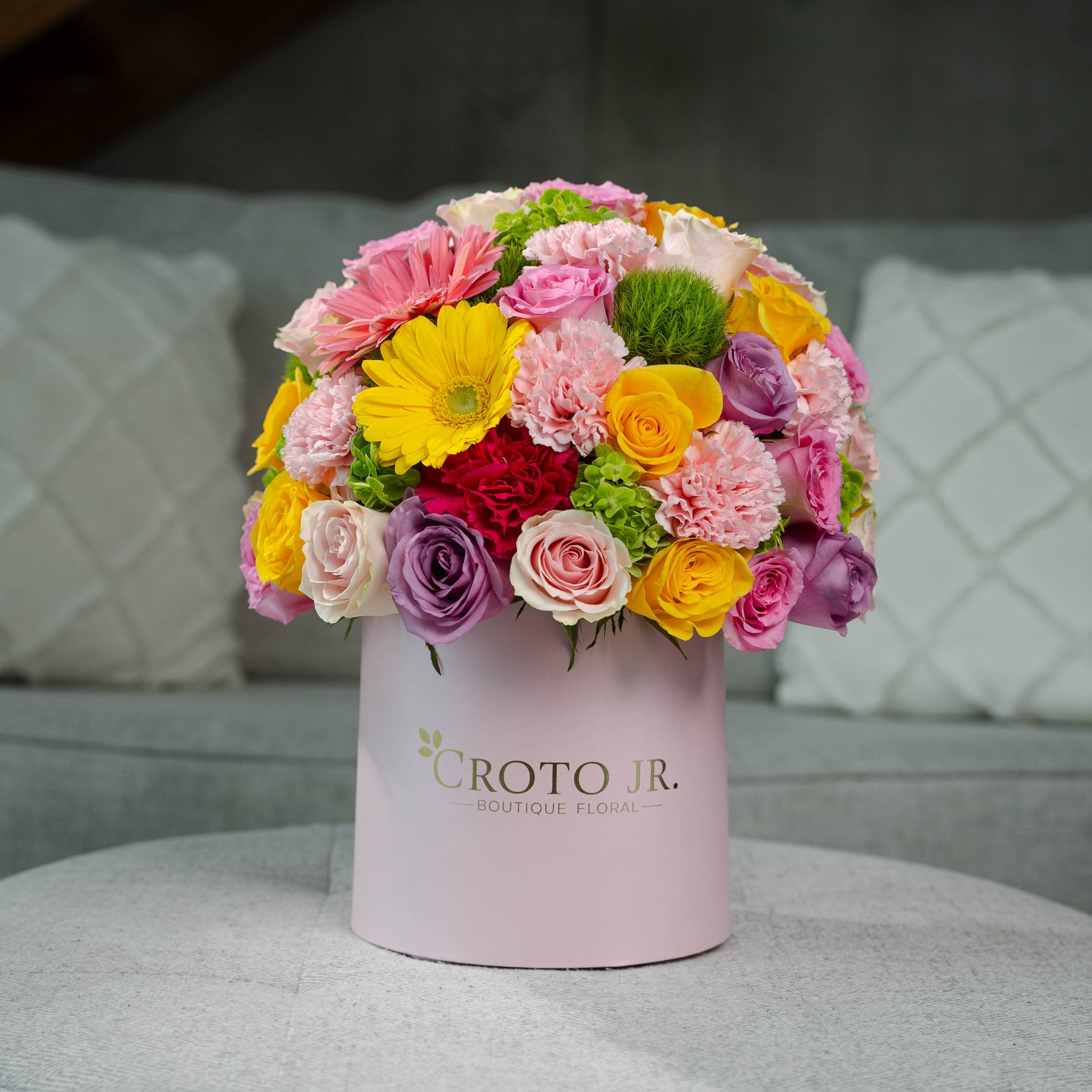 Precioso y único diseño base redonda con flores surtidas como rosas, margaritas ect...