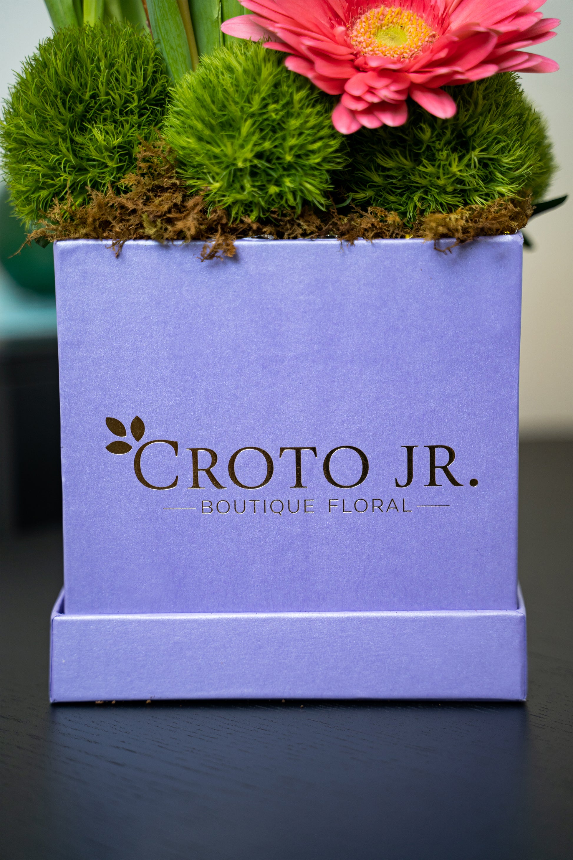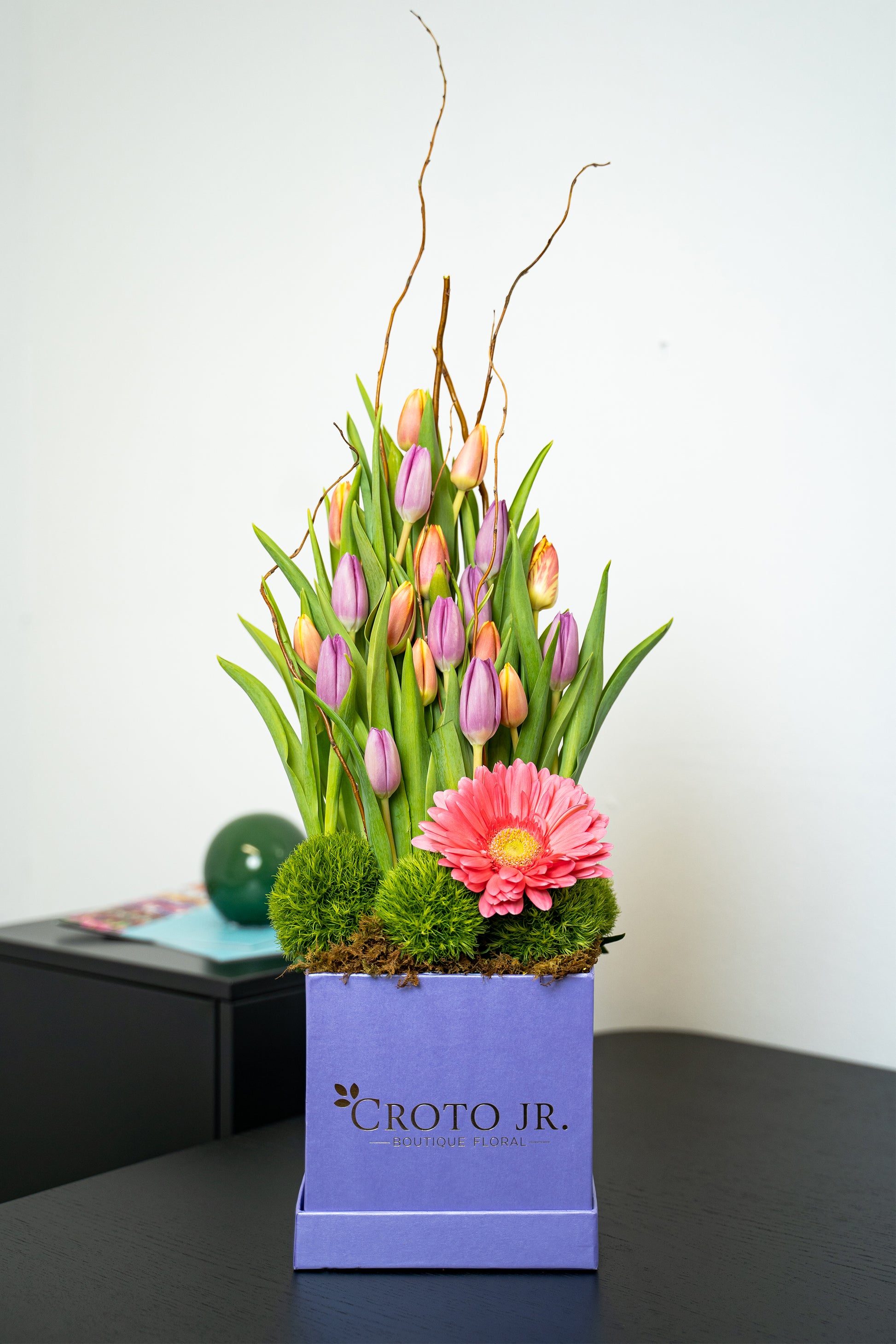 Delicado diseño de tulipanes con margarita africana en nuestra base personalizada. Perfecto para los amantes de los tulipanes.