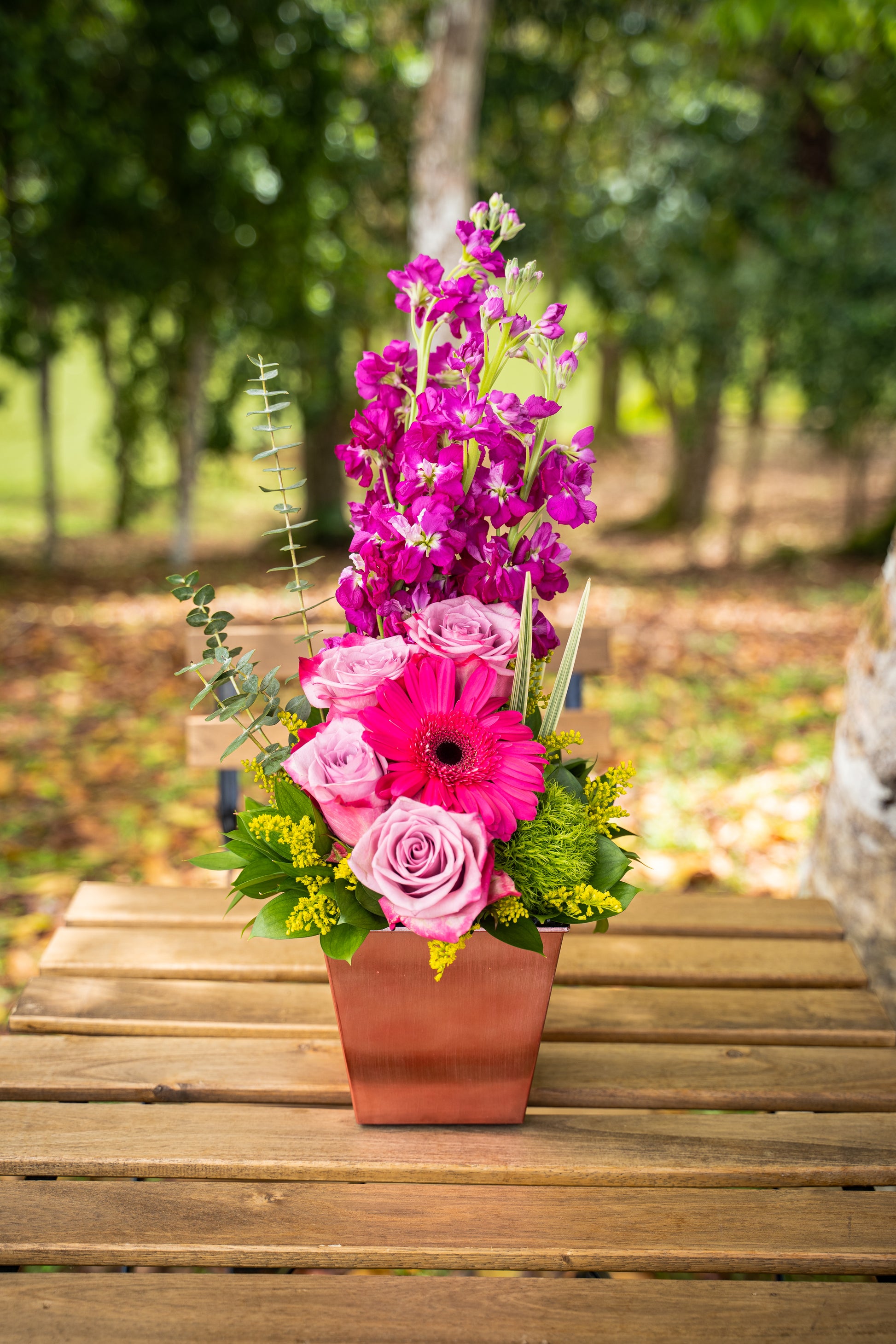 Diseño confeccionado con rosas, margaritas africanas y stock