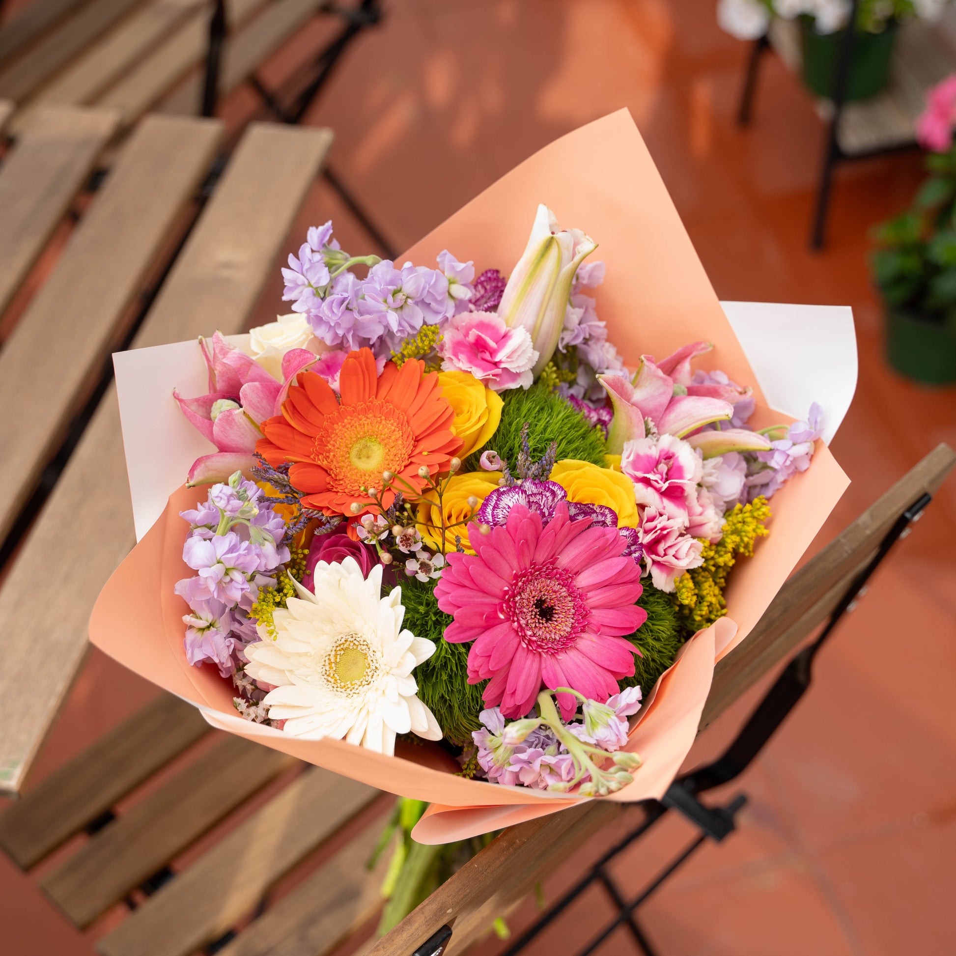 Ramo de flores surtidas de temporada con envoltura en papel coreano.