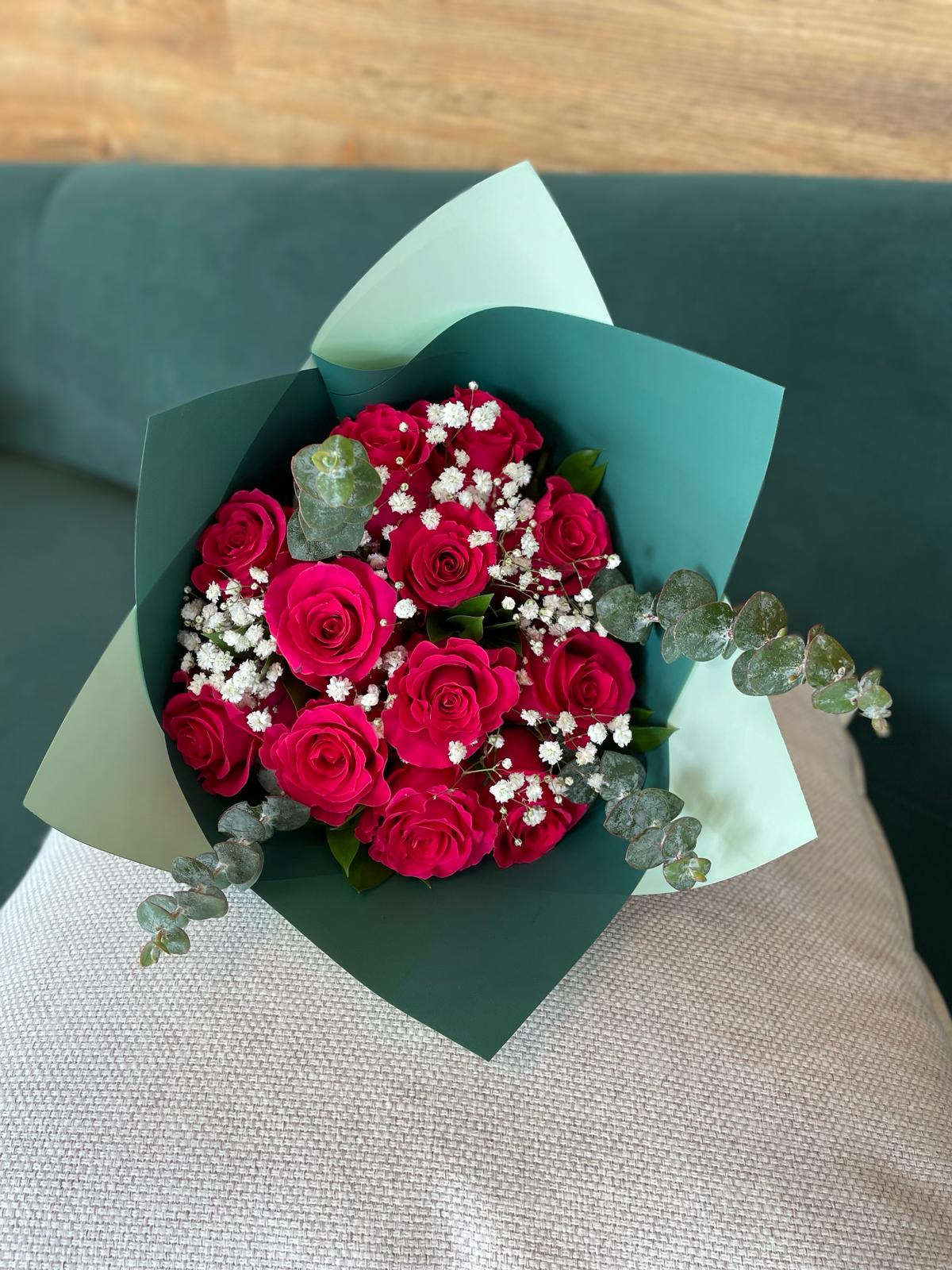 SOLO RECOGIDO EN TIENDA. Hermoso Bouquet de 12 rosas empacado. (A Bouquet made with 12 roses, foliage and wraping)